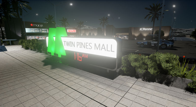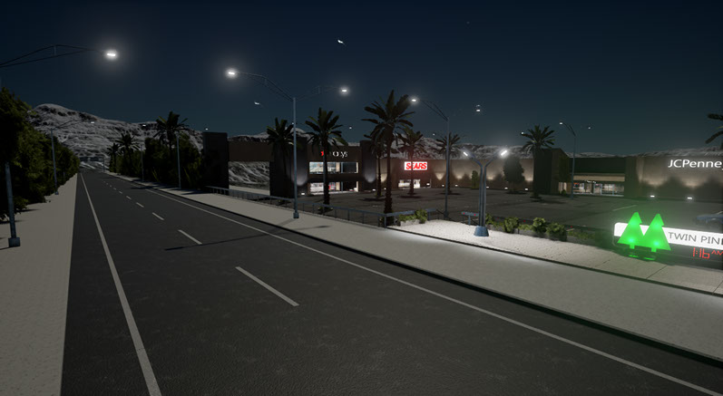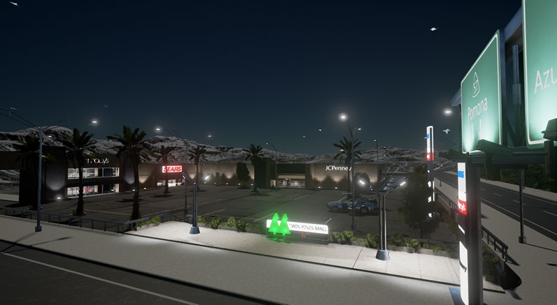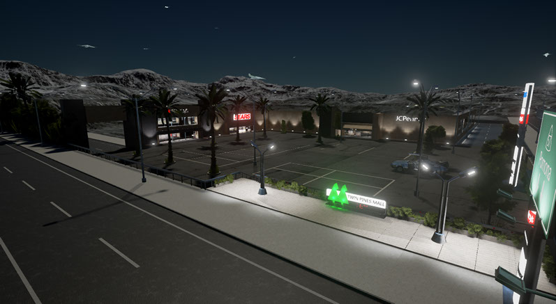 La dificultad en el diseño del centro comercial sugió a la hora de la iluminación. Demasiados puntos de luz, que harían que bajaran los frames por segundo de la simulación, en tiempo real.